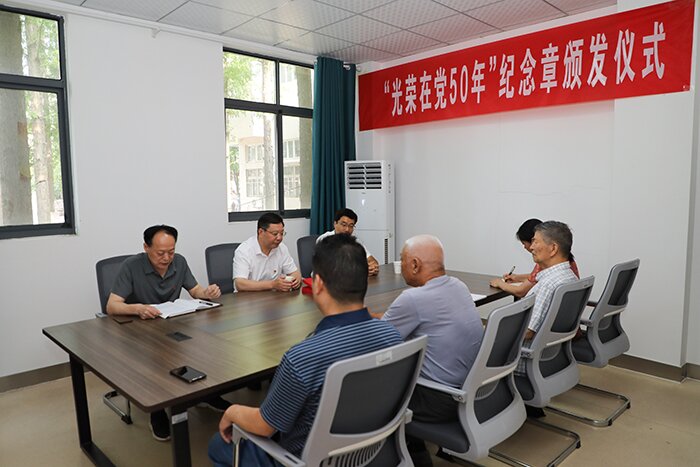 7月1日上午,在喜迎中国共产党建党101周年之际,离退休党总支室举行庄重简朴的“光荣在党50年”纪念章颁发仪式,党委委员、副院长黄远友,党委委员、组织部长钱锐等出席会议,颁发仪式由离退休党总支书记时乾主持,离退休党总支委员、在职党员等参加颁发仪式。