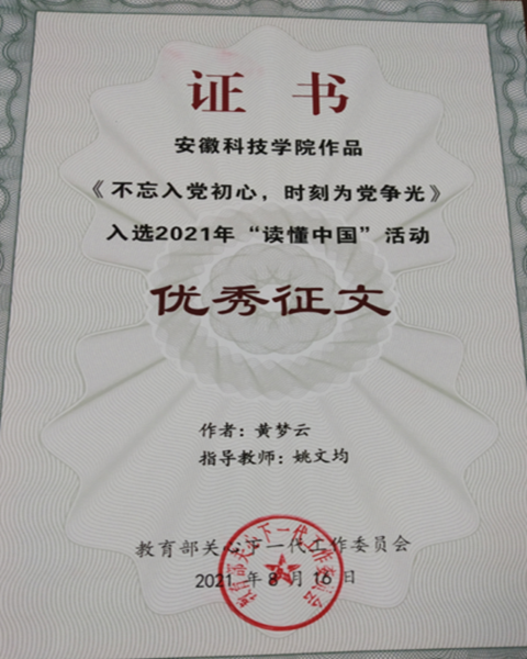 日前,在教育部关工委开展的 “读懂中国”活动中,QY球友会关工委获2021年“读懂中国”活动优秀组织奖,选送的征文《不忘入党初心,时刻为党争光》获优秀征文奖。