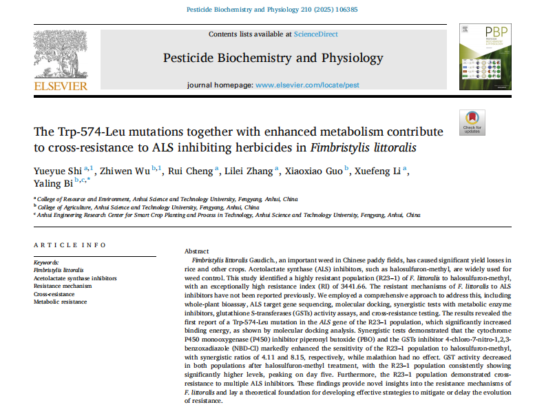 近日,我校农学院毕亚玲教授团队在国际知名期刊《Pesticide Biochemistry and Physiology》(中科院一区Top期刊,IF=4.2)发表了题为“The Trp-574-Leu mutations together with enhanced metabolism contribute to cross-resistance to ALS inhibiting herbicides inFimbristylis littoralis”的研究论文。该研究首次揭示了稻田恶性杂草水虱草(Fimbristylis littoralis Gaudich.)对乙酰乳酸合成酶(ALS)抑制剂类除草剂的抗性机制。硕士研究生史悦悦和青年教师吴志文博士为共同第一作者,毕亚玲教授为通讯作者,QY球友会为唯一完成单位。