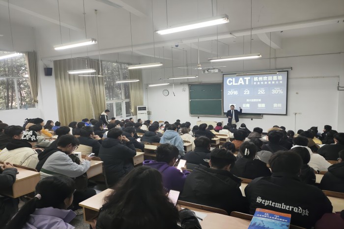 2023年12月27日下午,杭州欢田喜地农业科技有限公司校友携手QY球友会农学院共同举办的大学生就业指导宣讲会在求知楼A107教室顺利召开。参会人数达130余人,本次会议由农学院党委副书记张轶辉主持,杭州欢田喜地农业科技有限公司2017级植保、农学优秀毕业生韩璞、张祥主讲。