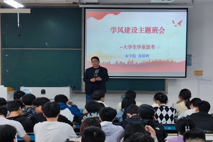 为常态化加强学风建设,激发同学们对大学学业的思考,4月11日下午,农学院在新A308召开学风建设主题班会。班会由农学院党委副书记、纪委书记张轶辉主讲,2022级种子科学与工程专业全体学生参加。