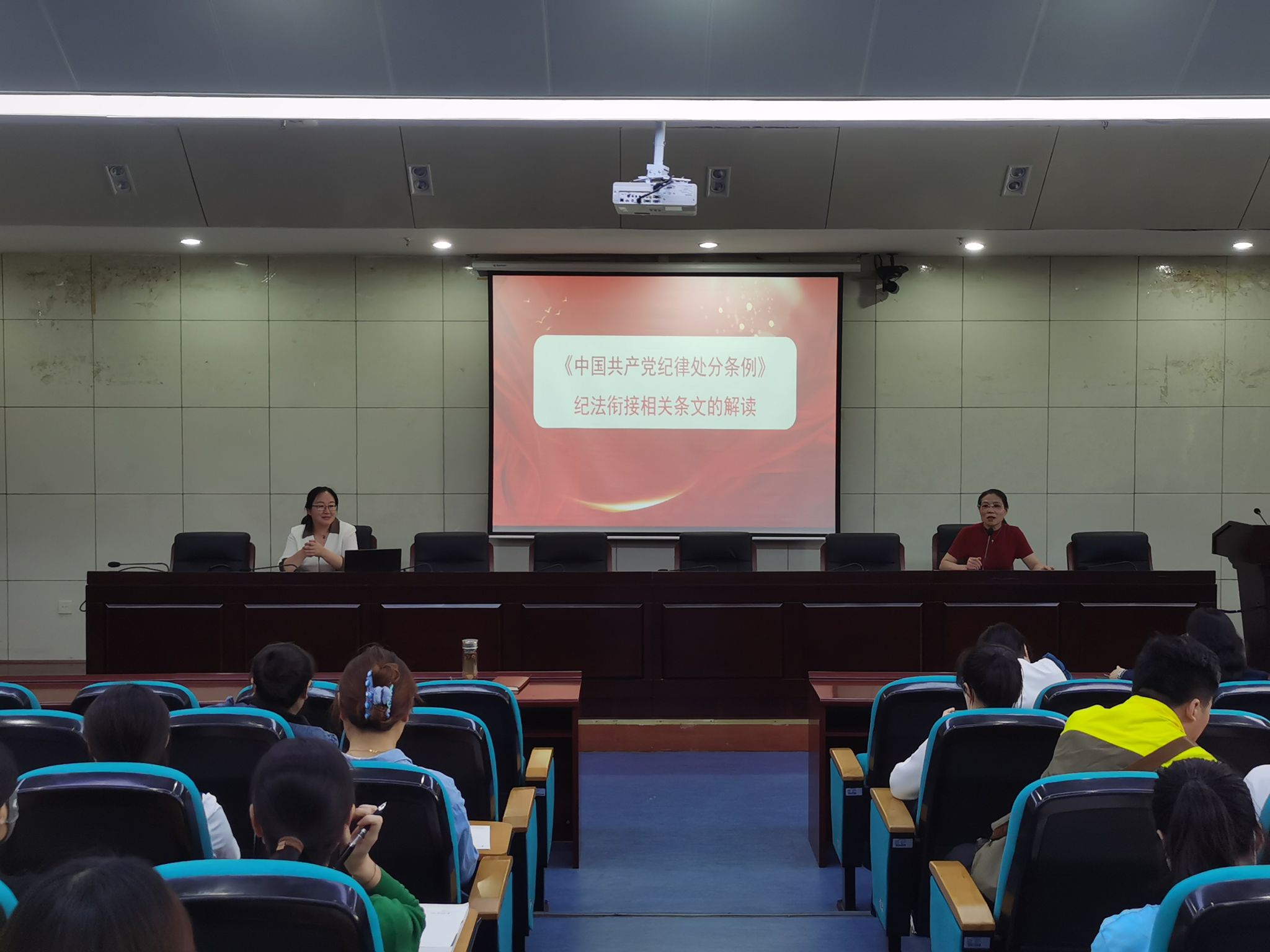 为推动党纪学习教育走深走实,进一步强化教职工纪法观念和师德师风建设,5月15日下午,外国语学院与人文学院联合举办党纪学习教育专题党课,两个学院的全体教师听取党课。党课由外国语学院党委书记蔡为青主持。