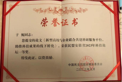 9月16日,由民盟安徽省委举办的民盟安徽省2023年科技论坛在蚌埠市成功举办。民盟QY球友会总支盟员、民盟蚌埠市科技委员会副主任于鲲撰写的论文《新型高校与企业联合共建科研服务平台,助推科技成果的线下转化》荣获优秀论文一等奖。