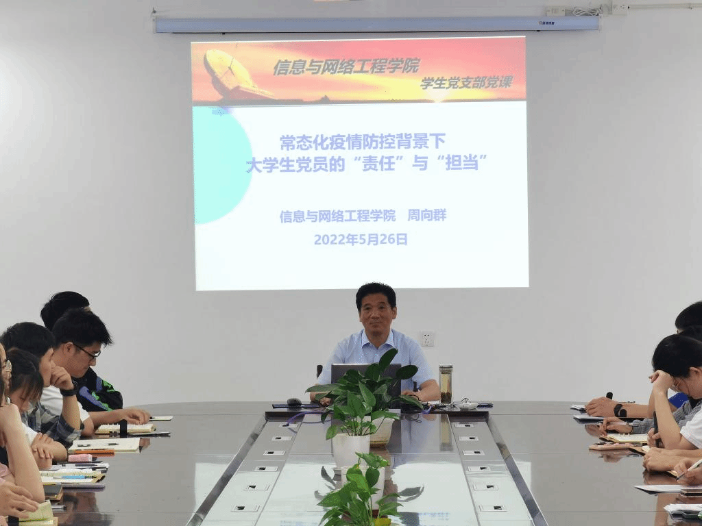 为巩固党史学习教育成果,进一步落实好各级党委政府和学校关于疫情防控工作部署要求,充分发挥大学生党员的先锋模范作用,扎实做好常态化疫情防控工作,5月26日晚,信息与网络工程学院正处级组织员周向群在尚行楼B418会议室为学院全体学生党员上了一堂生动的党课。