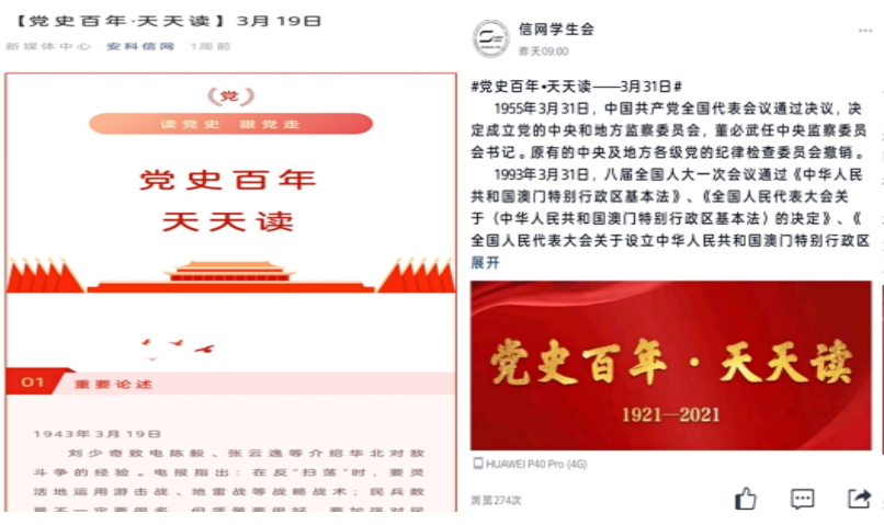 在微信平台上,充分利用学院“安科信网”微信公众号,开设《党史百年-天天读》专栏,分设“读党史-跟党走”专区;在“信息与网络工程学院分团委”官方QQ上设置“我的团 我的党”、“团团来分享”特色栏目,分享党史学习教育相关内容,采取图文并茂的方式,打造弘扬红色文化、传承红色基因的网络媒体新阵地,充分展现中国共产党百年辉煌党史,再现中国共产党带领中国人民艰苦奋斗的光辉历程,极大地激发了同学们对党史学习的热情,各平台线上推送的党史学习资料,平均日阅读量达到近300次。