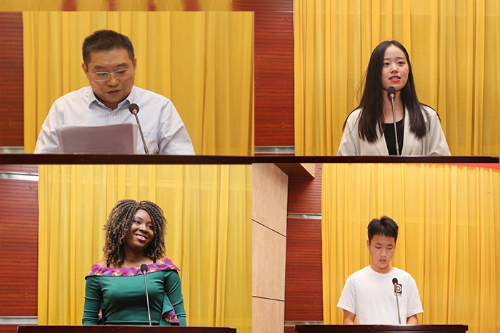 典礼上,研究生校内导师代表、农学院黄先忠教授,在校研究生代表、2019级农艺与种业领域研究生牛玲,新生代表、2020级农艺与种业领域研究生留学生Clevie Balongana(中文名 娜娜)、2020级畜牧领域研究生张涛同学先后发言。