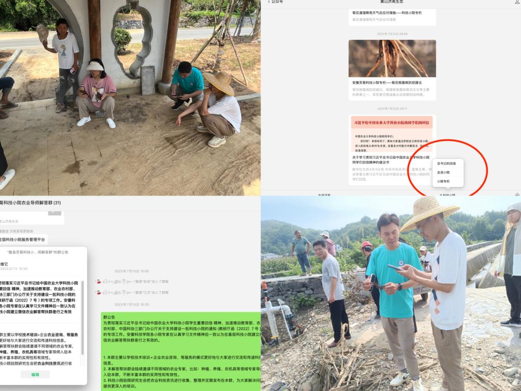 在黄山济高公司微信公众号建设“科技小院”专栏,定期发布与当地农业生产相关的文章、视频、图片等内容,涵盖种植技术、病虫害防治、肥料使用、灾害防范、新型农业装备、市场信息、灌溉管理等方面的知识,持续加大科学种植知识的宣传普及。同时,建立了“歙县贡菊科技小院农业专业导师解答群”,邀请学校各领域专家老师进群,及时解答生产一线遇到的困难。线上和线下、小院产业一线和学校科技高地紧密结合,真正做到解民生、治学问。