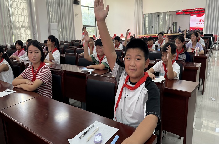 庄严授任:7月24日,“红领巾宣讲团”竞选仪式引发全村关注。20名少年经自我介绍、事迹讲解、团长竞选演讲三轮角逐脱颖而出,凤阳县电视台全程记录绶带时刻。