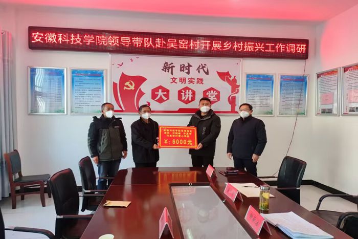 此次考察调研,是学校发挥服务社会职能、融入乡村振兴战略的一项有力举措。李震代表学校为两个定点帮扶村分别捐赠了现金。本次捐赠的款项由我校优秀校友郭凯(安徽来一克实验科技有限公司总经理)、许晓峰(合肥诺为尔基因科技服务有限公司总经理)和毕夏坤(力康生物医疗科技控股有限公司中国区销售总监)共同筹集。(特约通讯员:刘晓丹 摄影:李新伟 审核:陈丰)