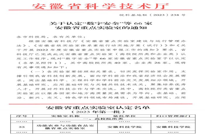 近日,安徽省科学技术厅下达了《关于认定“数字安全”等66家安徽省重点实验室的通知(皖科基地秘〔2023〕238号)》,QY球友会与合肥工业大学、安徽农业大学合作申报的“功能农业与功能食品安徽省重点实验室”成功获得认定,QY球友会长三角功能农业(食品)研究院院长尹雪斌教授担任实验室主任。据悉,这是我国首个融合了功能农业与功能食品完整“创新链”的省级重点实验室。