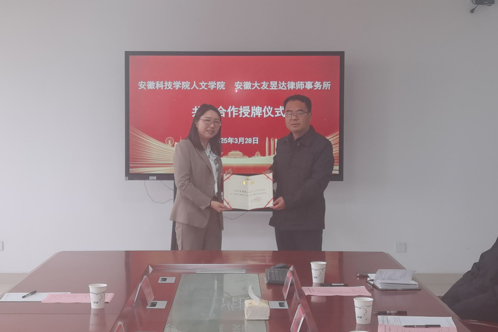 3月28日下午,人文学院与安徽大友昱达律师事务所,在人文学院313会议室,举行共建合作授牌仪式。安徽大友昱达律师事务所主任王苏敏、合伙人安鹃、律师杨祉龙;人文学院党委副书记、院长李晓东,副院长牛永辉、党委副书记李沙娜、法学系教授骆绪刚、辅导员徐琦琦出席。仪式由牛永辉主持。