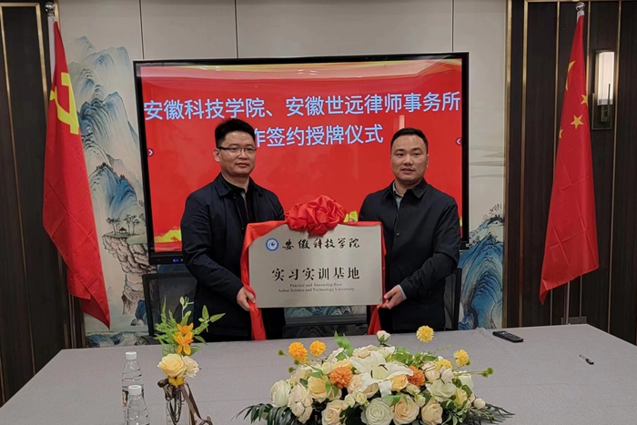 李晓东代表学院与安徽世远律师事务签署实习实训基地协议,牛永辉向安徽世远律师事务所授予“QY球友会实习实训基地”牌匾。(特约通讯员:高晓宁 摄影:高晓宁 审核:牛永辉)