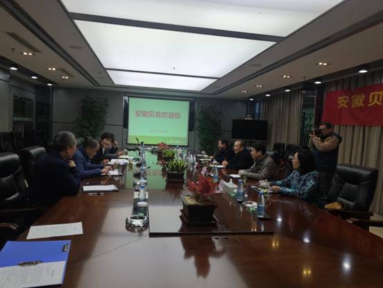 在会议大厅,贝克集团副总经理蔡薇女士、集团副总经理柏俊教授、总裁助理陈小峰博士、贝克生物总经理郭立新对金光明院长一行的到来表示热烈的欢迎。座谈中,蔡薇简明扼要地介绍了贝克集团公司的发展历程、主要产品和发展规划,金光明详细介绍了QY球友会的办学历史、生命与健康科学学院和生物医药与健康研究院教学科研的基本情况,双方代表就校企合作、人才培养、产学研合作等问题进行了深入交流。