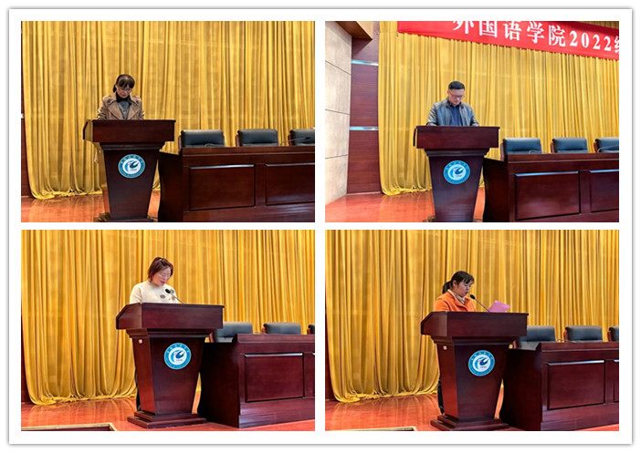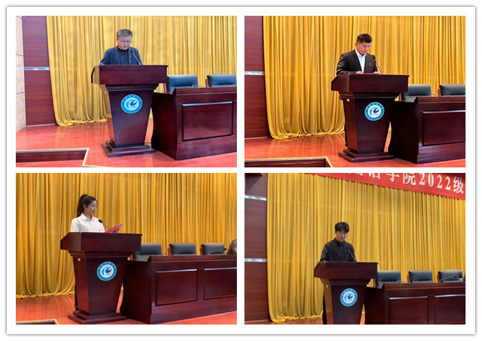会上,学院团委副书记宋兵兵宣读了《外国语学院2022级新生入学教育实施方案》;英语专业教研室负责人陆宗丽、翻译专业教研室主任赵景梅结合课程开设和人才培养方向,分别对专业进行了介绍;韩名利老师作为教师代表向新生分享了英语学习经验和方法,提出外语学习学以致用的建议;学院学生会主席宗紫璇、翻译223班班长奚友超分别代表老生和新生进行了发言。