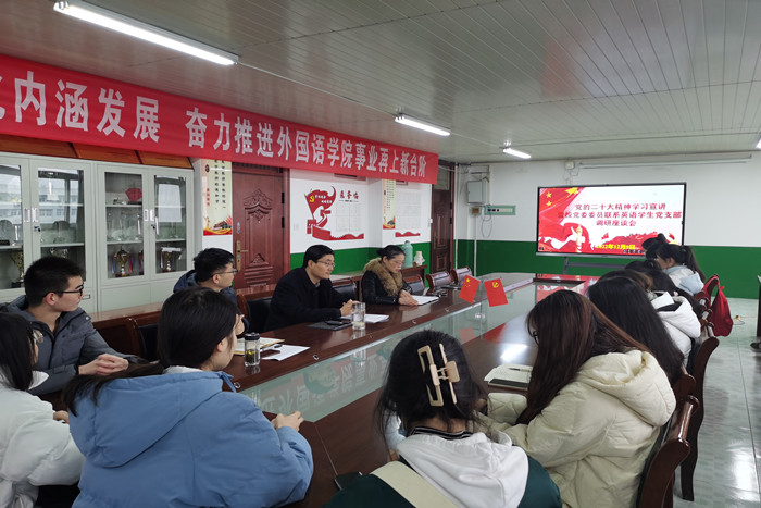 为深入学习宣传贯彻党的二十大精神,推动党的二十大精神在校园落地落细落实,12月9日下午,校党委委员、组织部部长钱锐深入其联系指导的英语专业学生党支部和学生干部中宣讲党的二十大精神。