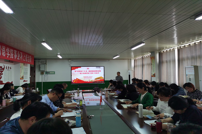 为全面深入学习贯彻党的二十大精神,切实把广大师生员工的思想和行动统一到党的二十大精神上来,全面把握习近平总书记关于教育的重要论述的深刻内涵,强化学院师德师风建设,守正创新、自立自强,为学院高质量发展注入强劲动能,4月19日,外国语学院党委书记蔡为青以《学习贯彻党的二十大精神 砥砺奋进新征程——做人民满意的“四有”好老师》为题向学院全体教职工讲授专题党课。