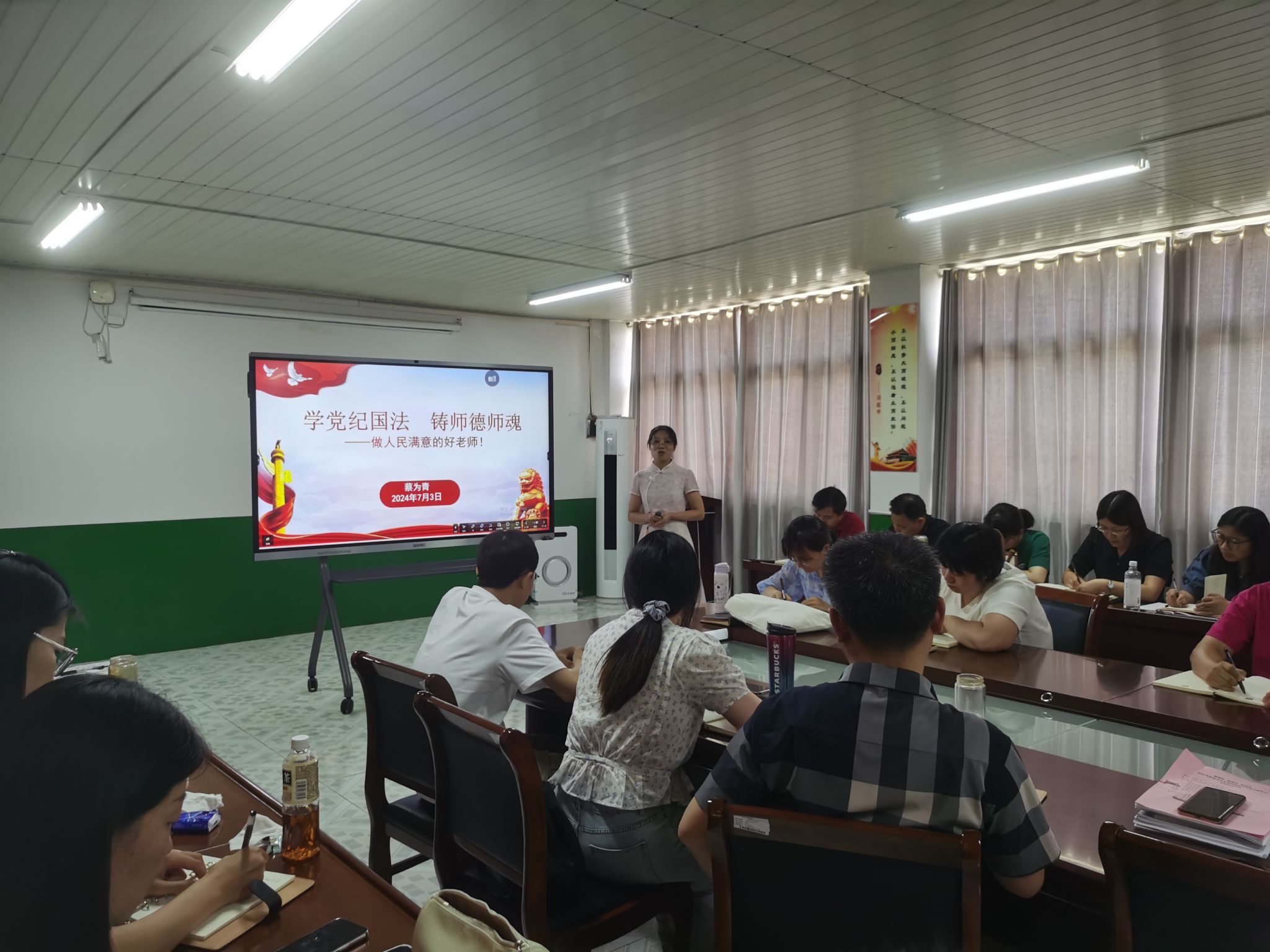 为推进党纪学习教育走深走实,培育良好师德师风,7月3日下午,外国语学院党委书记蔡为青在学院会议室为全院教师做了题为“学党纪国法 铸师德师魂——做人民满意的好老师”的党纪学习教育暨师德师风警示教育专题党课。