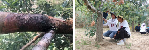 2.绿色防控技术有成效:充分发挥大学生专业优势,示范推广苹果树腐烂病“喷水精准诊断技术”及“一壮、二降、三精准”和“刮治+双层涂药”减药增效绿色防控新技术。