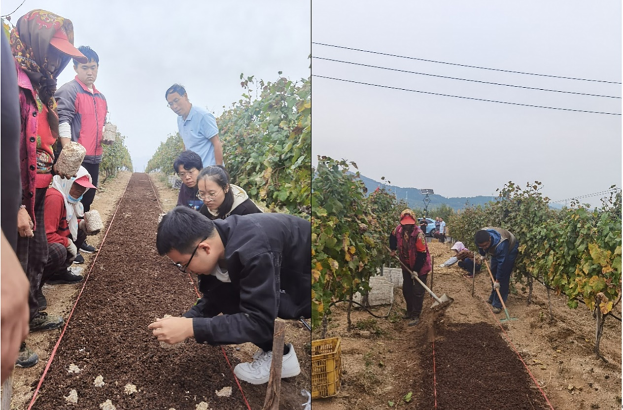 鲁东大学食用菌创新科技志愿在莱山区酒庄指导农民在葡萄架下种植大球盖菇