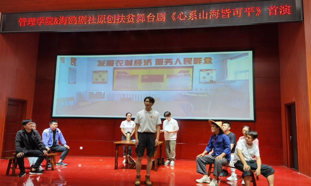 博士团以中国海大青年学子爱国力行、智援扶贫事迹为创作蓝本,编创红色扶贫艺术舞台剧《心系山海皆可平》,融入中华优秀传统音乐作品,生动讲述了中国海大师生凝心聚力、学以致用,助力红色革命老区乡村振兴的帮扶故事,真情实感的事迹宣讲与专业水准的艺术表演,激励着新时代青年为全面推进乡村振兴而团结奋斗。