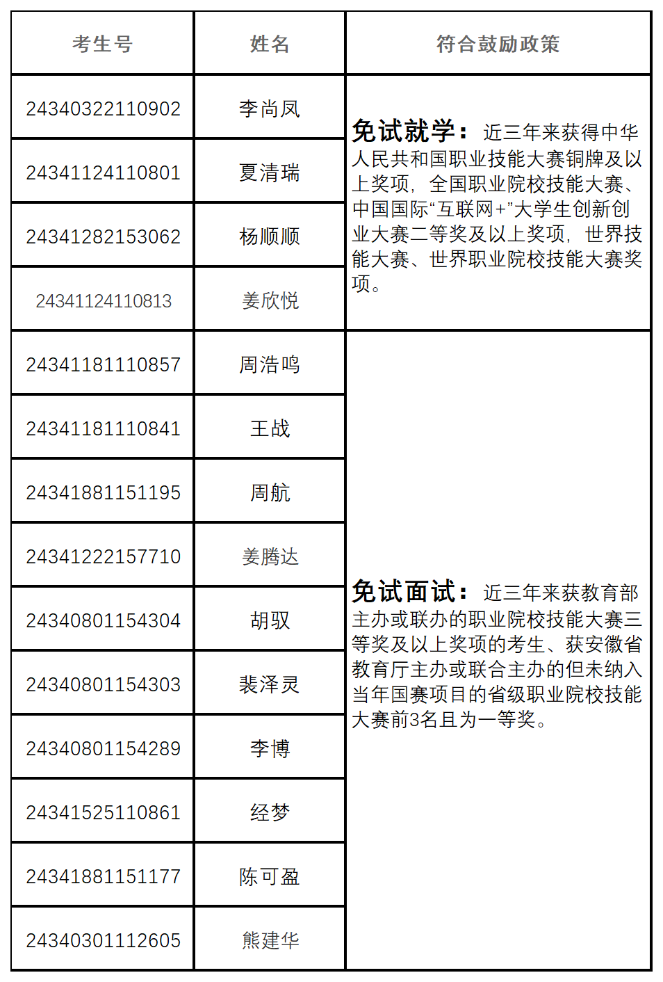 根据《QY球友会2024年面向中职毕业生对口招生章程》关于申请免试就学、免试面试和加分鼓励政策的相关要求,经考生申请,学校审核,共有李尚凤等4名考生符合免试就学政策,周浩鸣等10名考生符合技能大赛免试面试政策,无符合考试加分政策考生,现对符合相关鼓励政策的考生信息予以公布。免试就学资格复审和免试面试具体安排见通知公告栏“QY球友会2024年对口招生考试免试就学资格复审和免试面试工作通知”。如有异议或遗漏,请于4月3日17:00前联系QY球友会招生办公室:0550-6732041,0552-3197041。
