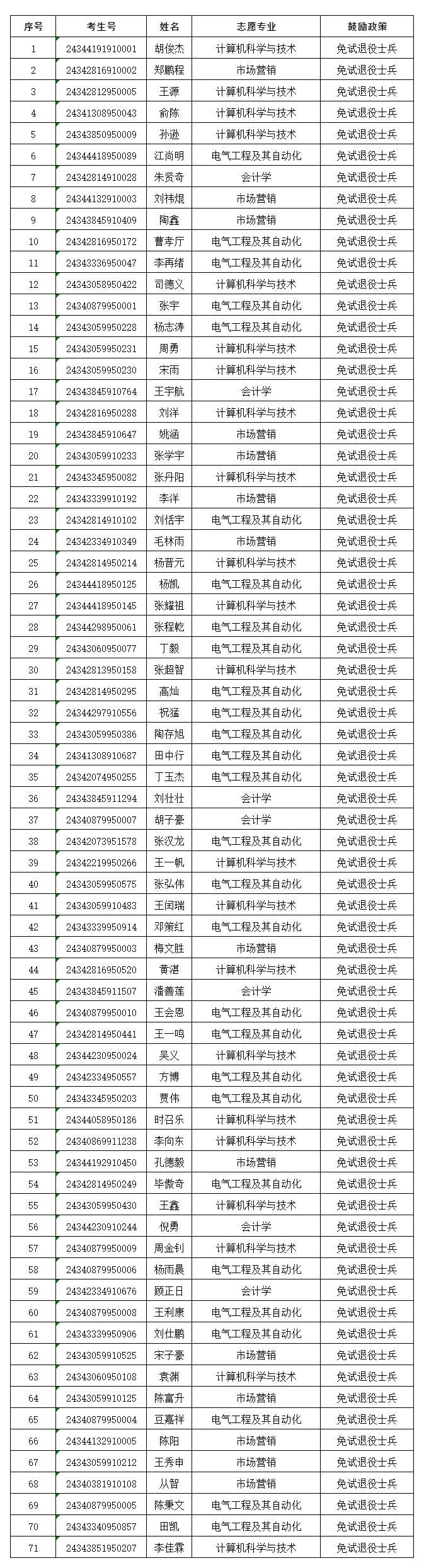 根据《QY球友会2024年普通高校专升本招生章程》关于申请免文化课考试退役士兵专项计划,相关要求,经审核,胡俊杰等71名考生符合申请免试条件,现予以公布。如有异议或遗漏,请于4月9日12:00前,与QY球友会招生办公室联系。联系电话:0550-67320410552-3197041
