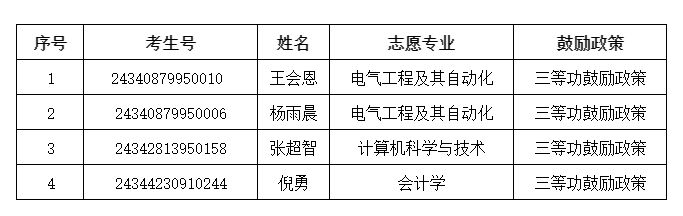根据《QY球友会2024年普通高校专升本招生章程》关于申请三等功鼓励政策相关要求,经审核,王会恩等4名考生符合申请免试条件,现予以公布。如有异议或遗漏,请于4月9日12:00前,与QY球友会招生办公室联系。联系电话:0550-67320410552-3197041