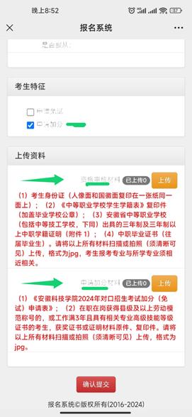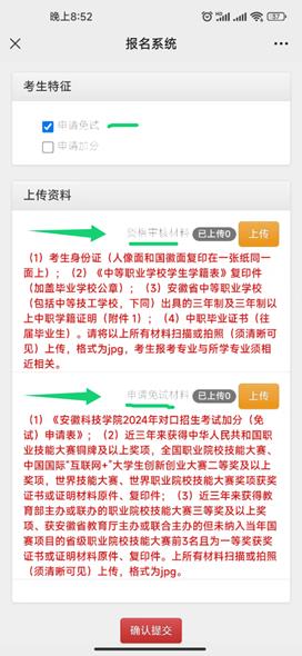 第六步:申请技能大赛免试、考试加分鼓励政策的考生,在“考生特征”板块,还需先勾选自己申报的鼓励政策选项,在上传“资格审核材料”基础上,还需按照要求上传“申请加分材料”或者“申请免试材料”。无误后,点击确认提交按钮,一旦提交,不可更改。