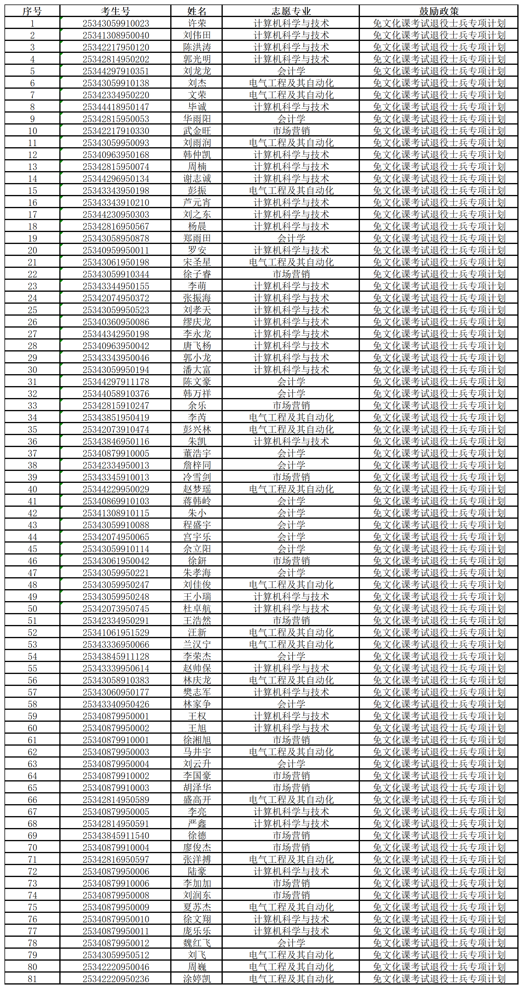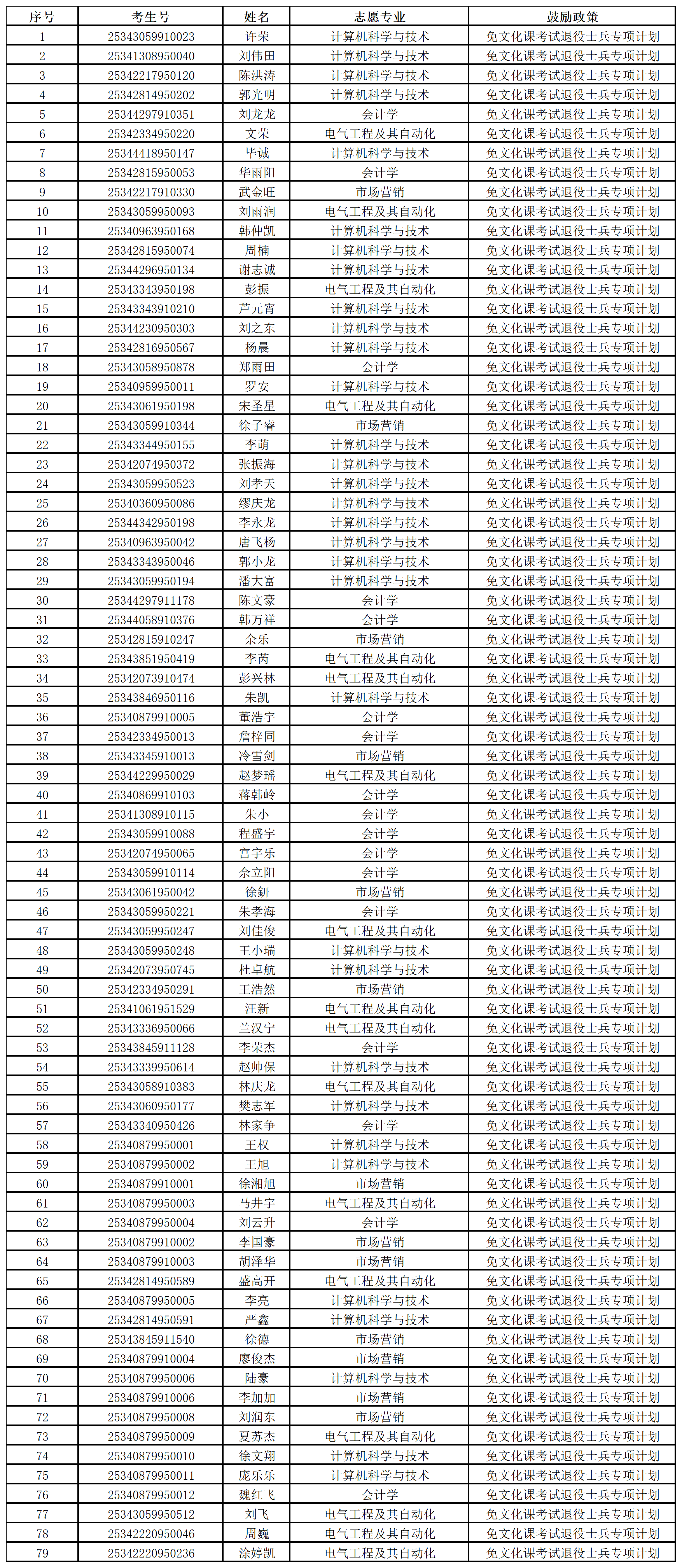根据《QY球友会2025年普通高校专升本招生章程》关于申请免文化课考试退役士兵专项计划相关要求,经审核,许荣等79名考生符合申请免试条件,现予以公布。如有异议或遗漏,请于4月7日17:00前与QY球友会招生办公室联系。联系电话:0550-6732041,0552-3197041。